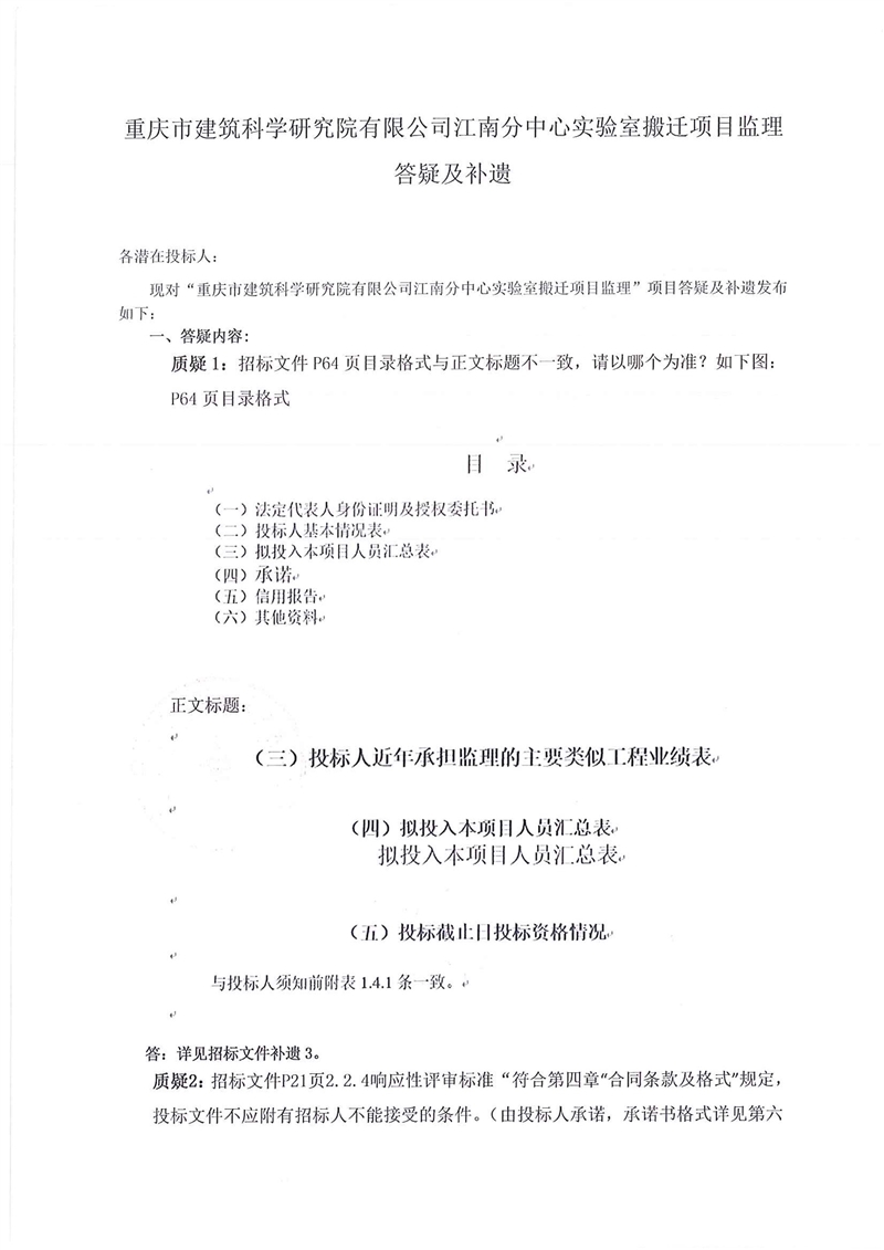 現對“重慶市建筑科學研究院有限公司江南分中心實驗室搬遷項目監理”項目答疑及補遺發布如下: