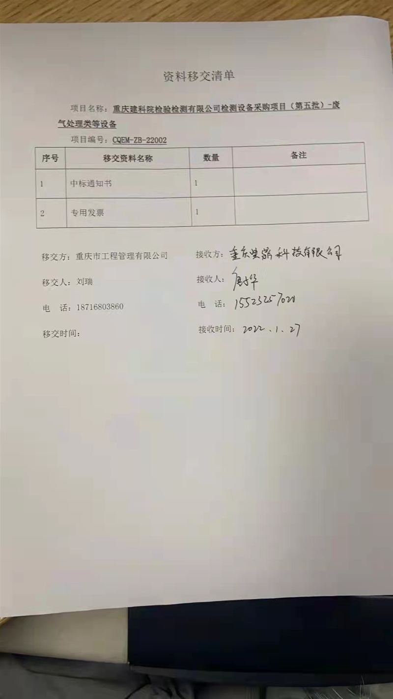 重慶建科院檢驗檢測有限公司委托重慶市工程管理有限公司對我公司檢測設備采購項目(項目號:CQEM-ZB-22002 )重慶建科院檢驗檢測有限公司檢測設備采購項目(第五批)-廢氣處理類等設備進行了公開招標采購,現已完成全部采購程序。確認重慶典鼎科技有限公司為檢測設備采購項目(第五批)-廢氣處理類等設備采購項目中標人,中標價為446400元(大寫:肆拾肆萬陸仟肆佰元整)。