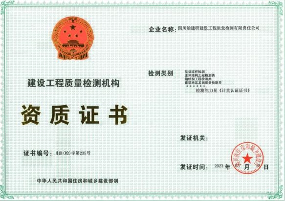 近日,經(jīng)四川省住房和城鄉(xiāng)建設(shè)廳核準,重慶設(shè)計集團市建科院所屬子企業(yè)四川渝建研建設(shè)工程質(zhì)量檢測有限責任公司(以下簡稱“渝建研”)申請重新核定的建設(shè)工程質(zhì)量檢測機構(gòu)資質(zhì)于2023年3月成功獲批并順利取證。