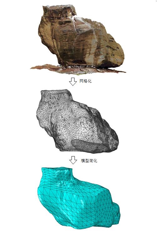 在對紗帽石穩定性進行評估過程中,市建科院技術團隊與重慶交通大學相關專家經過多次溝通,確定了定性分析+數值模擬的評估方案。評估中定性分析了紗帽石的當前所處環境、形態特征、結構特征、破壞模式等,作出紗帽石穩定性定性分析初步評價。另外,評估采用三維激光掃描儀,對紗帽石進行3D掃描,復原出紗帽石的三維模型,再將其導入有限元計算軟件中,建立含有紗帽石的邊坡模型,對其在多種荷載工況下的穩定性進行了有限元計算,最終提出了合理的評估和建議。